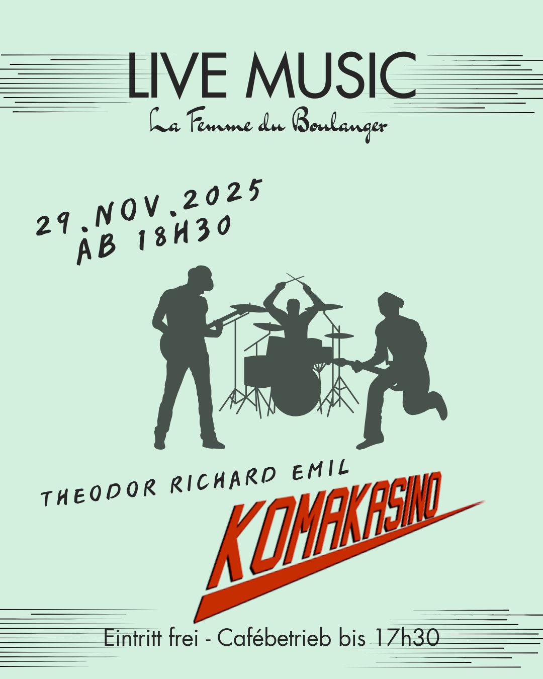 Berlin hat diesen Samstag einen Geheimtipp - und Ihr seid dabei! Samstag, 29.11.2025 ab 18h30 @lafemmeduboulanger_berlin Brünnhildestr. 8, 12159 Berlin Unser line up: THEODOR RICHARD EMIL - Krautrock aus Deutschland (@theodor_richard_emil) KOMAKASINO (@komakasino ) begrüßen wir nach dem tollen Konzert zur Fête de la Musique 2025 schon zum zweiten Mal - wir freuen uns riesig! Bis 17h30 haben wir ganz normalen Cafébetrieb, dann machen wir schnell Platz und ab 18h30 wird gefeiert! EINTRITT FREI! Und leckeres Bier ist auch garantiert von @brauerei_flessa See you!!!!